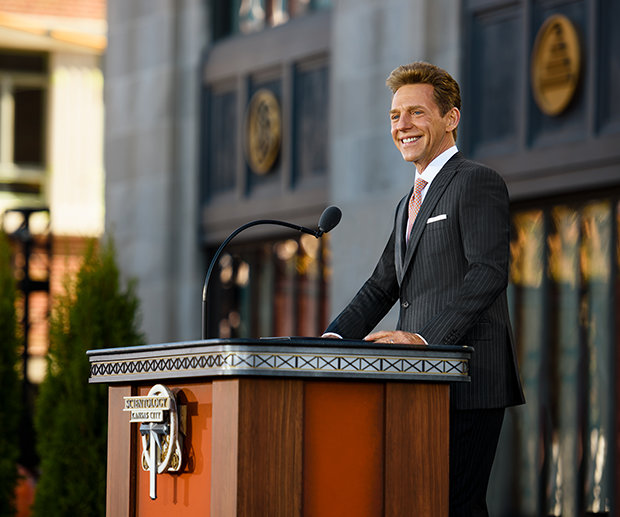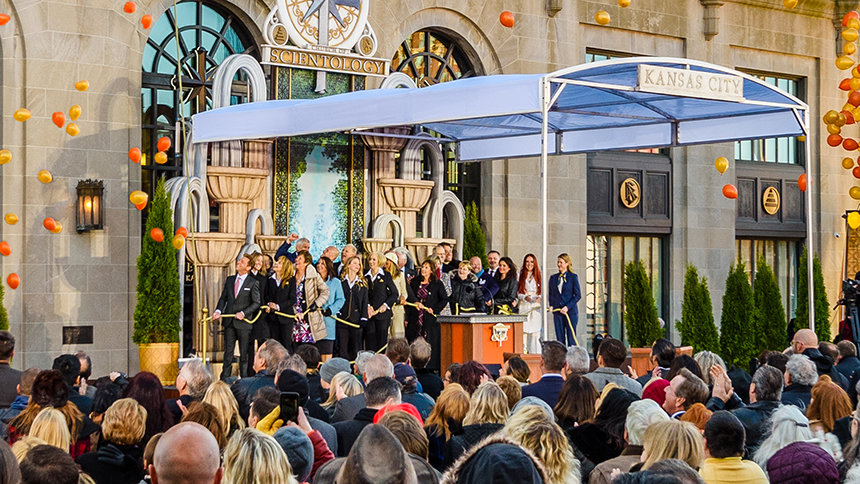 Ο κ. Ντέιβιντ Μισκάβιτς, ο εκκλησιαστικός ηγέτης της θρησκείας της Scientology, τέλεσε τα εγκαίνια. Στην εναρκτήρια ομιλία του, ο κ. Μισκάβιτς τόνισε τη σπουδαιότητα του εύθυμου πνεύματος της ημέρας προς τιμήν της νέας έδρας της Εκκλησίας στις Μεσοδυτικές Πολιτείες: «Κάνσας Σίτι, όπου, όπως λένε, οι κάτοικοι μιλούν τα πιο αυθεντικά “αμερικάνικα” σε όλες τις 50 πολιτείες, και το μπάρμπεκιου είναι το καλύτερο από οπουδήποτε στον γαστρονομικό γαλαξία. Είναι επίσης μια πόλη όπου το “εργασιακό ήθος” εξακολουθεί να είναι αυτό που ήταν πριν η λέξη “ήθος” χάσει το νόημά της. Οπότε, ναι, Κάνσας Σίτι, πάμε!».