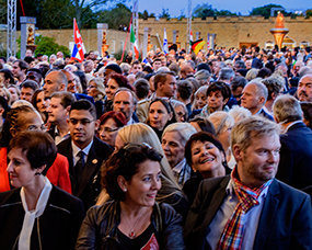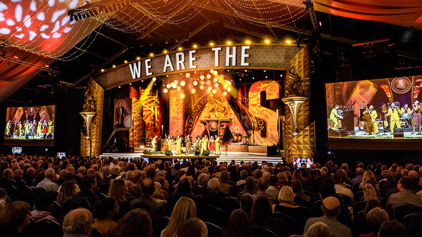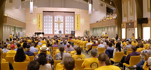 Πέρα από τις πύλες της Έπαυλης, μετά από τις εισόδους και τη μακριά καμπύλη του δρόμου προς το υπόστεγο και τη Μεγάλη Αίθουσα, σε μια σκηνή που ανεγέρθηκε κάτω από την κάλυψη μιας τεράστιας τέντας, μέλη της Διεθνούς Ένωσης Σαηεντολόγων από περισσότερες από 65 χώρες γέμισαν την ατμόσφαιρα με διαφορετικές γλώσσες καθώς περιφέρονταν στην αρένα με σκοπό να γιορτάσουν την ανθρωπιά τη δική τους και όλης της ανθρωπότητας.