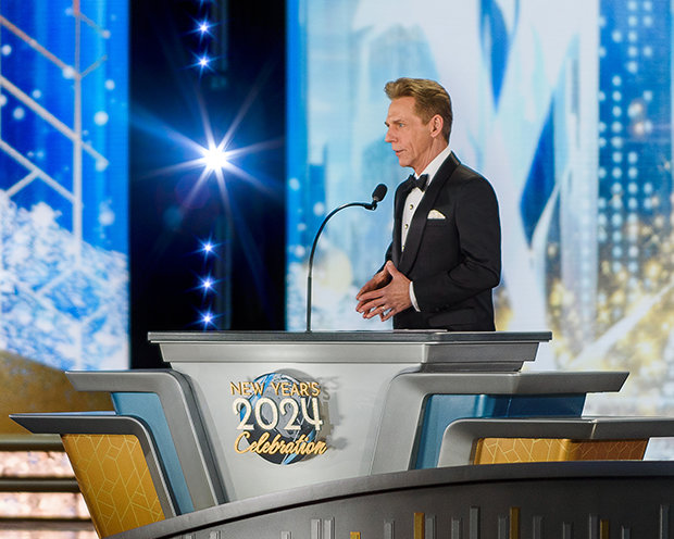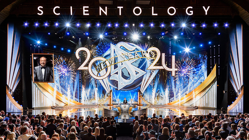 ΣΤΟ ΞΕΚΙΝΗΜΑ ΤΟΥ 2024, ο κ. Μισκάβιτς καλωσορίζει το κοινό στον Εορτασμό της Πρωτοχρονιάς, τονίζοντας την απεριόριστη εξάπλωση της Εκκλησίας με το πραγματικό στιλ της Scientology.