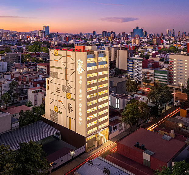 VIVA LA MEXICO Η μελλοντική Εκκλησία της Scientology του Ντελ Βάγιε είναι ένας φάρος πνευματικής ελευθερίας 12 ορόφων που υψώνεται πάνω από μια από τις πιο πολιτισμικά ζωντανές γειτονιές της Πόλης του Μεξικού. Η επιγραφή ύψους 25 μέτρων προσφέρει ένα καλωσόρισμα από χιλιόμετρα μακριά προς κάθε κατεύθυνση.