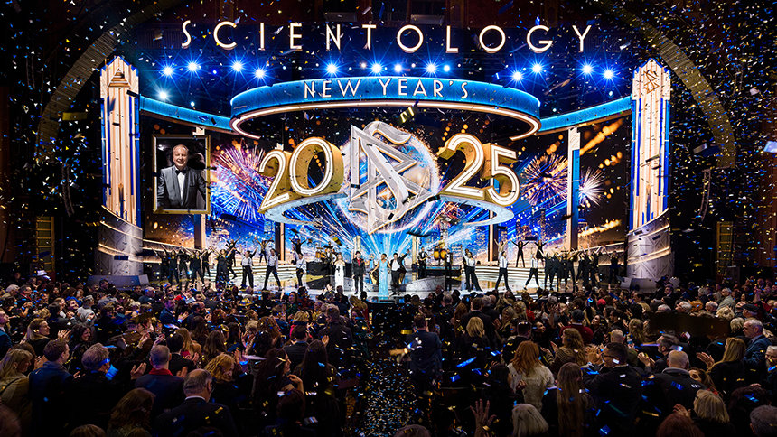 Και, στη συνέχεια, με δυνατές επευφημίες που αντήχησαν σε όλο το μέγαρο, ο κ. Ντέιβιντ Μισκάβιτς, ο εκκλησιαστικός ηγέτης της θρησκείας της Scientology, διέσχισε τη σκηνή των 60 μέτρων για να καλωσορίσει τους πάντες στον Εορτασμό της Πρωτοχρονιάς.