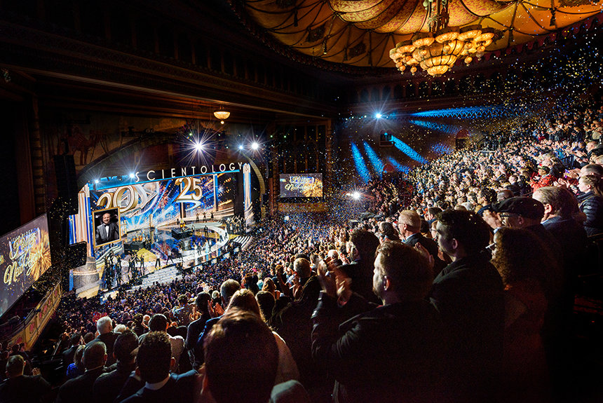 ΤΟ ΜΕΓΑΛΕΙΟ ΤΟΥ SHRINE AUDITORIUM ΣΤΟ ΛΟΣ ΑΝΤΖΕΛΕΣ προσφέρει το τέλειο σκηνικό, καθώς πάνω από 6.500 άτομα συγκεντρώνονται για να καλωσορίσουν το νέο έτος με στιλ της Scientology.
