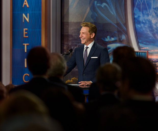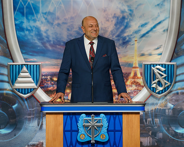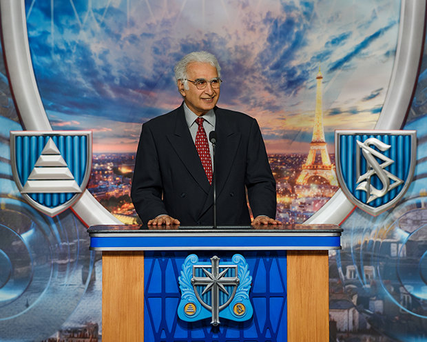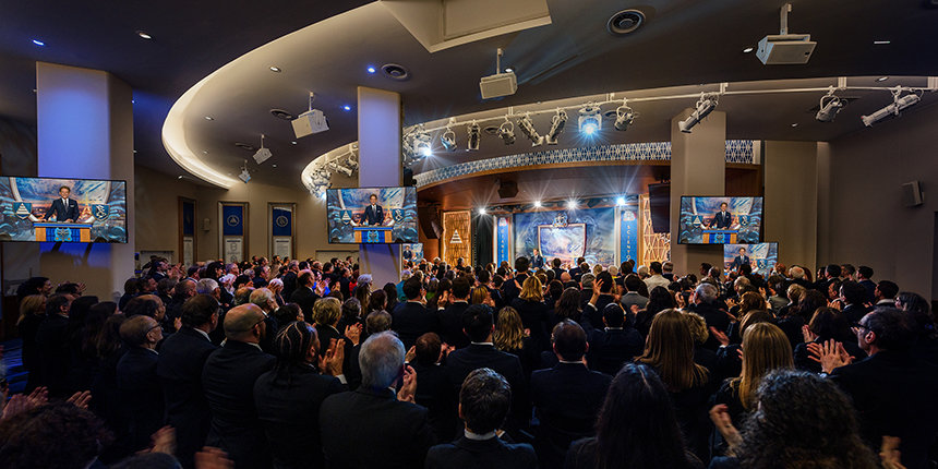 Αλλά οι πιο δυνατές επευφημίες, τόσο στο εσωτερικό όσο και παντού στους υπαίθριους χώρους όπου χιλιάδες ακόμη παρακολουθούσαν την εκδήλωση σε γιγαντιαίες οθόνες που είχαν τοποθετηθεί σε τεράστιες τέντες για να εξυπηρετήσουν πλήθη που υπερέβαιναν τη χωρητικότητα, ήταν για τον κ. Ντέιβιντ Μισκάβιτς, τον Πρόεδρο του Συμβουλίου του Religious Technology Center, ο οποίος εγκαινίασε αυτό το εντυπωσιακό νέο κέντρο.