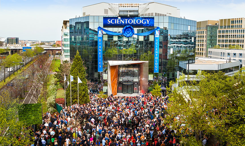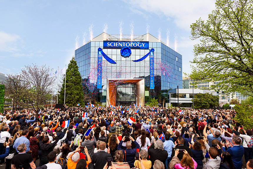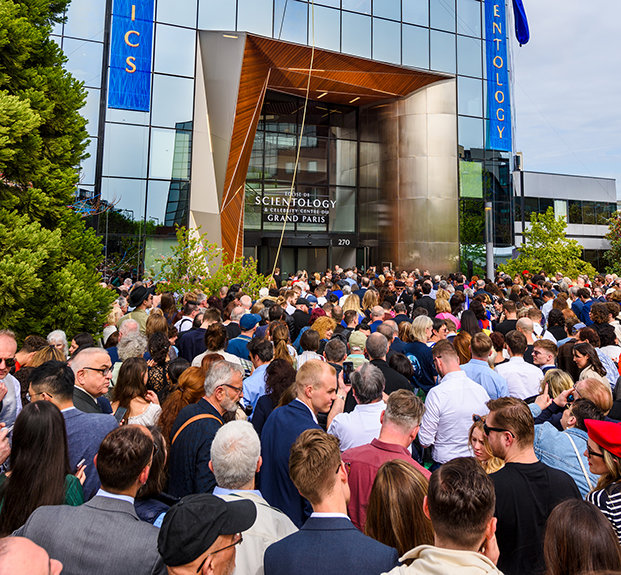 Τότε χιλιάδες ενθουσιώδεις ενορίτες και επισκέπτες που είχαν περιέργεια συνέρρευσαν με προσμονή στη μεγαλοπρεπή είσοδο της Εκκλησίας. Στη συνέχεια, καθώς η γιγάντια μπλε κορδέλα πάνω στο αστραφτερό κτίριο έπεσε στο έδαφος, έσκασαν πυροτεχνήματα, οι σερπαντίνες γέμισαν τον αέρα, οι πόρτες άνοιξαν διάπλατα και τα πλήθη πέρασαν το κατώφλι για να περιηγηθούν σ’ αυτή την καινούρια πνευματική έδρα, την εκπληκτική Ιδανική Εκκλησία της Scientology και Κέντρο Διασημοτήτων του Μεγάλου Παρισιού, που τώρα άνοιξε εντυπωσιακά.