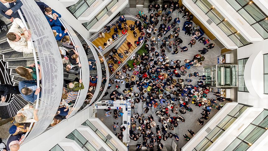 Πέρα από το αστραφτερό εξωτερικό και την ξύλινη πύλη με τον μοντέρνο γεωμετρικό σχεδιασμό, το επιβλητικό εσωτερικό αίθριο του κτιρίου αντανακλά την όψη μιας μαγευτικής σεκόγιας. Οι «ετήσιοι δακτύλιοι» που είναι ενσωματωμένοι ξεχωριστά στο μωσαϊκό δάπεδο και ένα κυκλικό κιγκλίδωμα που το περιβάλλει ένα σχέδιο φύλλων αντικατοπτρίζουν το μοτίβο της σεκόγιας, καθώς οι επισκέπτες ανεβαίνουν στον χώρο ύψους 15 μέτρων που λούζεται από το φως του ηλίου χάρη στον τεράστιο φεγγίτη ψηλά στο ταβάνι.